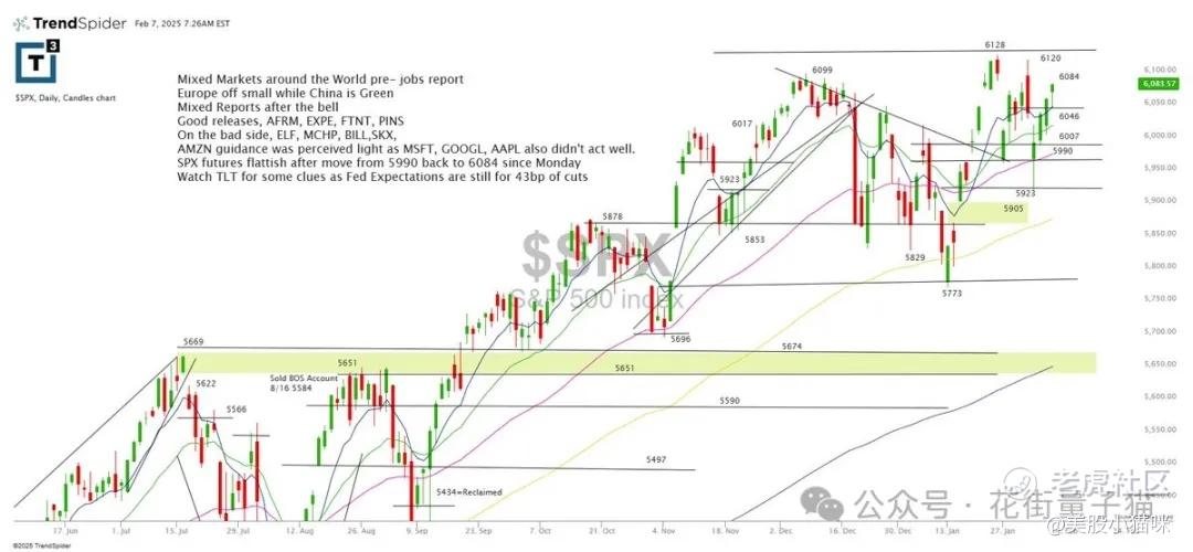 全球市场在就业报告发布前走势混合,欧洲小幅下跌,而中国上涨。好消息发布:AFRM、EXPE、FTNT、PINS。坏消息方面:ELF、MCHP、BILL、SKX,AMZN的指导意见被认为较弱,微软、谷歌、苹果的表现也不好。SPX期货在本周一从5990回升至6084后保持平稳。关注TLT,看看是否有线索,因为市场仍预计美联储将降息43个基点。