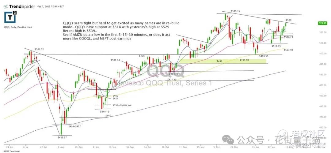 QQQ似乎在构建过程中难以激动,因为许多股票处于再构建模式。QQQ在518美元有支撑,而529美元是近期的高点。看看AMZN在前30分钟是否会创出低点,或者像谷歌、微软一样在财报后表现。
