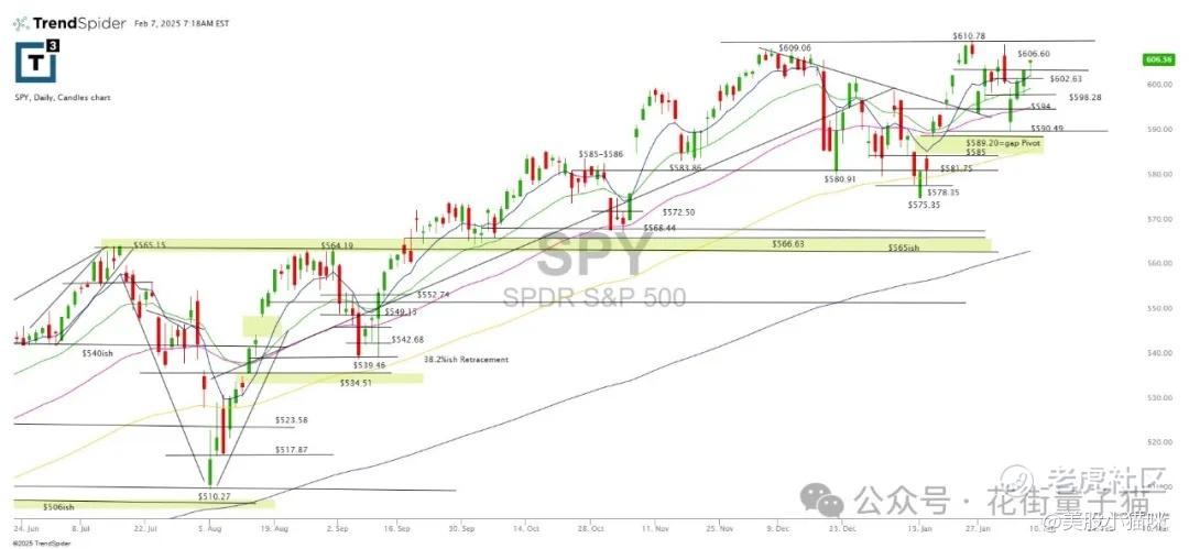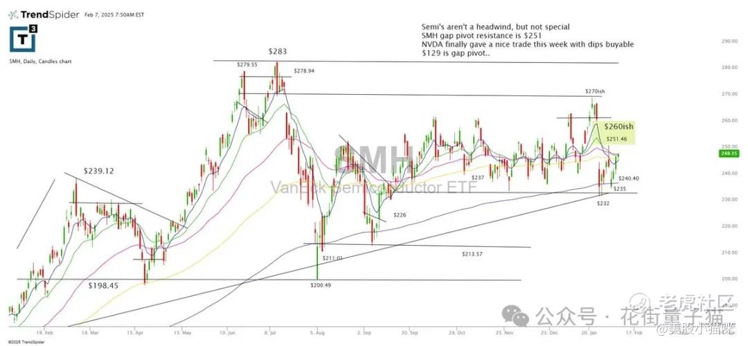 半导体板块的表现并不差,但也不算特别强劲。SMH的gap阻力位在251美元以上。NVDA本周提供了不错的交易机会,且下跌时可买入。