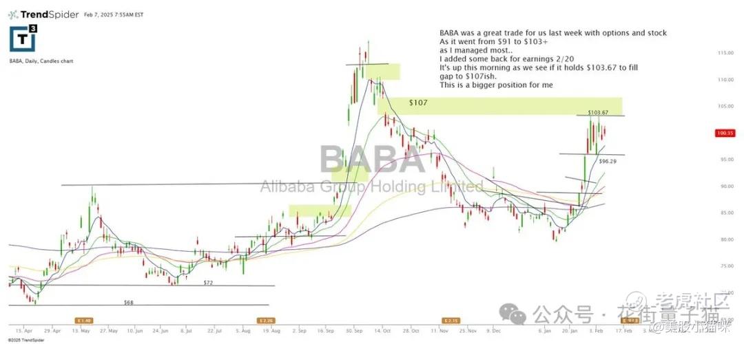 上周BABA是一次很好的交易,股价从91美元涨至103美元。我在2/20财报前增加了一些仓位。今天股价上涨,我们观察是否能够维持103.67美元的支撑,填补至107美元的缺口。这是一个更大的仓位。