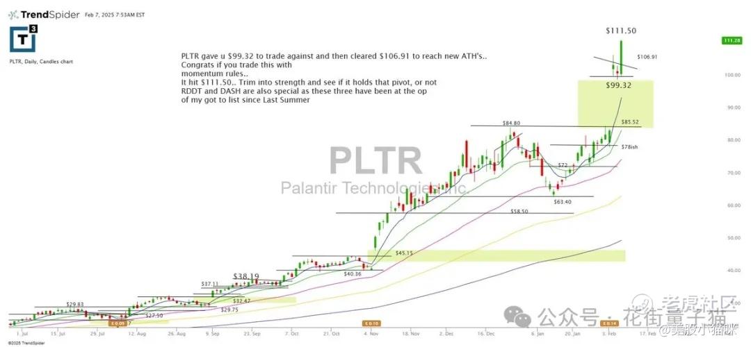 PLTR给出了99.32美元的交易机会,然后突破了106.91美元,创下新高。如果你能根据动量规则交易,恭喜你!它达到了111.50美元,进入强势阶段,看看它是否能维持这一支撑,或者是否保持该支撑。