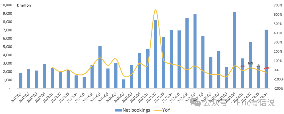 营收92.63亿欧,同比增长28%,环比增长24%,略微高于此前指引上限;2024全年营收282.63亿欧,同比仅增长2.6%;