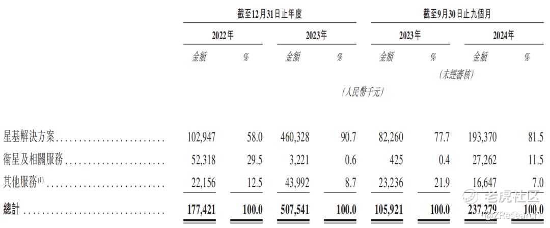 2022年、2023年及2024年前三季度,国星宇航的营收分别为1.77亿元、5.08亿元和2.37亿元。其中,星基解决方案是主要的营收来源,2023年收入占比为90.7%,同时该业务也是公司营收的增长引擎,带动公司总营收大幅增长,2023年及2024年前三季度的同比增长率分别为186.07%和124.02%。据招股说明书,星基解决方案收入快速增长主要得益于公司加强客户拓展并取得更高价值的合同,包括空间智能与算力服务解决方案及城市综合治理服务应用。