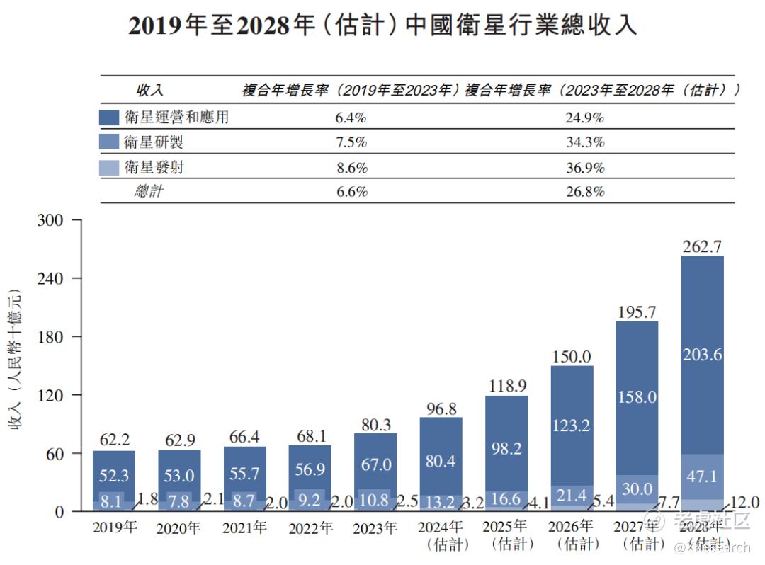 过去几年,中国卫星行业经历稳定增长。按收入计,中国卫星行业的市场规模由2019年的约人民币622亿元增加至2023年的约人民币803亿元,复合年增长率为6.6%。在利好政策及低轨卫星星座快速布局的推动下,中国商业航天行业快速发展。按收入计,中国卫星产业的市场规模预计将自2023年起按复合年增长率26.8%进一步增长,于2028年达到约人民币2,627亿元。