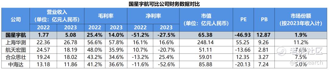 通过下表的财务数据对比可以看出,国星宇航无论是市场份额还是利润率水平均与深耕卫星领域多年的竞争对手具有较大差距。尽管国星宇航在AI卫星技术领域展现出一定的创新潜力,但其在财务表现和市场竞争力方面仍需进一步提升,以缩小与行业领先企业的差距。未来,国星宇航需要在技术创新和市场拓展方面加大投入,优化成本结构,提升盈利能力,以实现可持续发展。