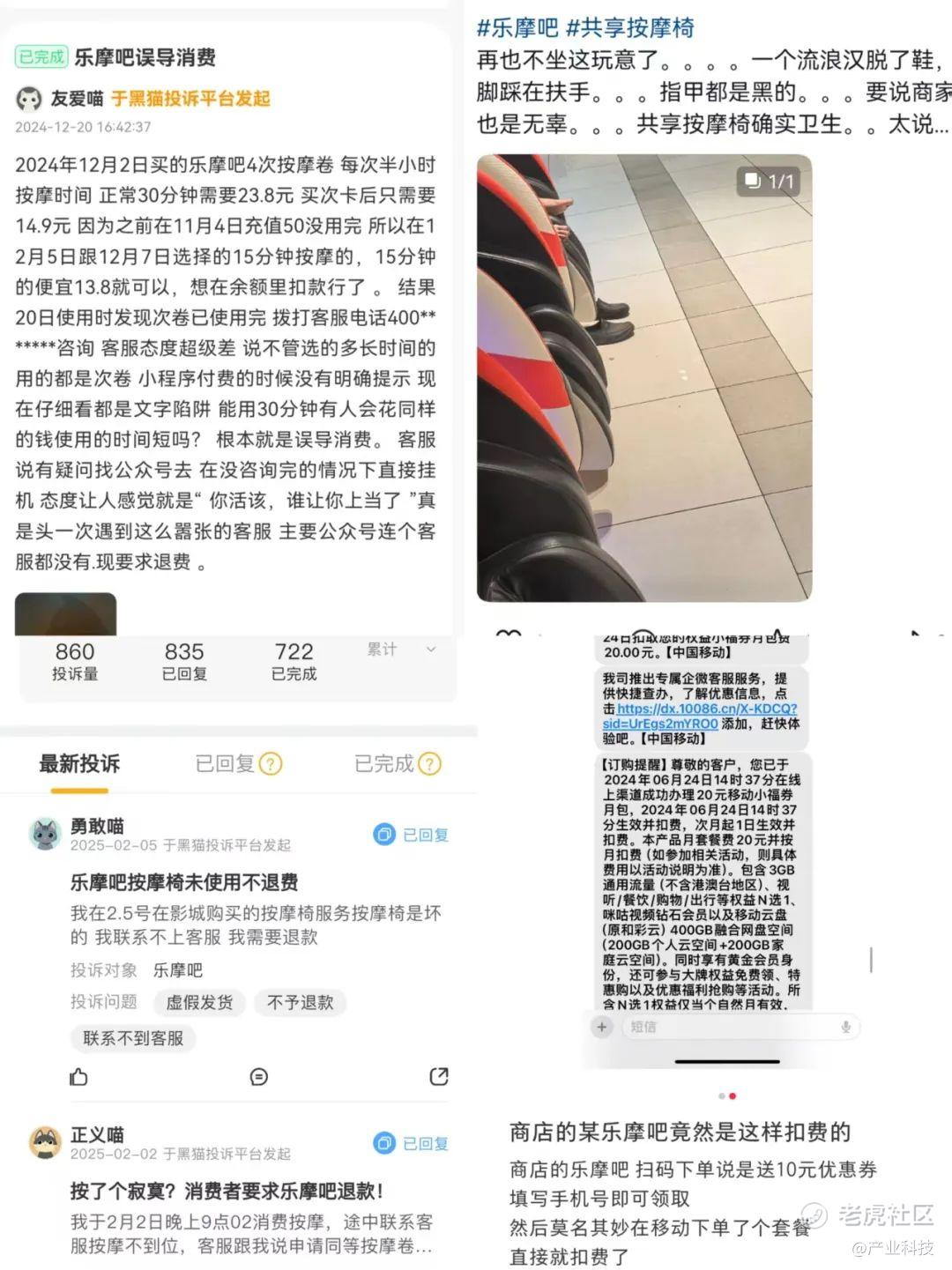 而对于智能按摩椅这种产品,今年春节看电影的不少消费者吐槽椅子设计不符合人体结构,窝脖子,坚持看下来一场电影真的很不容易,呼吁取消这个按摩椅,坐着看电影太累了;此外,按摩椅多设置于人员密集场所,有些地方卫生难以保障,网络上关于按摩椅污渍、卫生状况差的吐槽屡见不鲜,经常也有遇到充值无法使用、诱导错误消费、不退费、售后态度差的问题,严重影响消费者的使用意愿,真正的用户粘性和留存度堪忧。