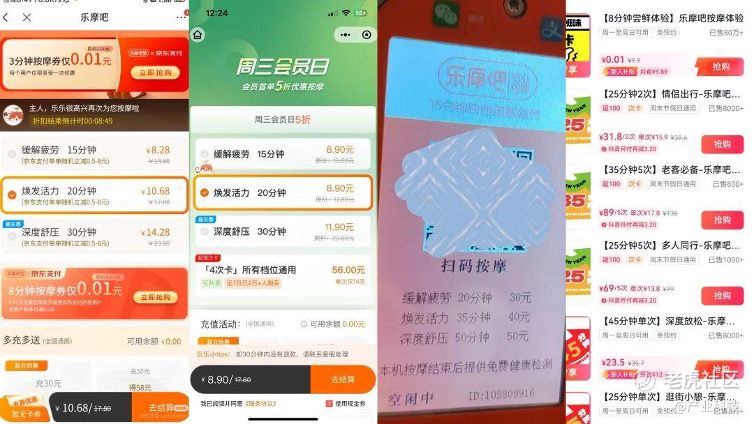 乐摩吧的基础服务价格主要分为三档,但在不同地区和投放场景下,乐摩吧的价格会根据场地的人流量、消费人群的消费能力等因素进行一定幅度调整,例如在北京的一些商场里,乐摩吧按摩设备扫码收费有13.80元钱15分钟“缓解疲劳”、17.80元钱20分钟“焕发活力”、23.80元钱30分钟“深度舒压”等服务,针对高频次使用的用户,线上还推出有充值包和包月、包季、包年套餐等。