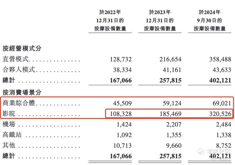 有意思的是,在招股书中,一组十分“反差”的数据让外界很好奇。商业综合体和电影院目前是为乐摩吧带来营收的主要场景,以2024年前三季度为例,商业综合体营收占比67.26%、影院占比19.28%,但影院铺设的按摩椅数量却远远超过其他场景,约占铺设总数的80%,是商业综合体的4.6倍左右。