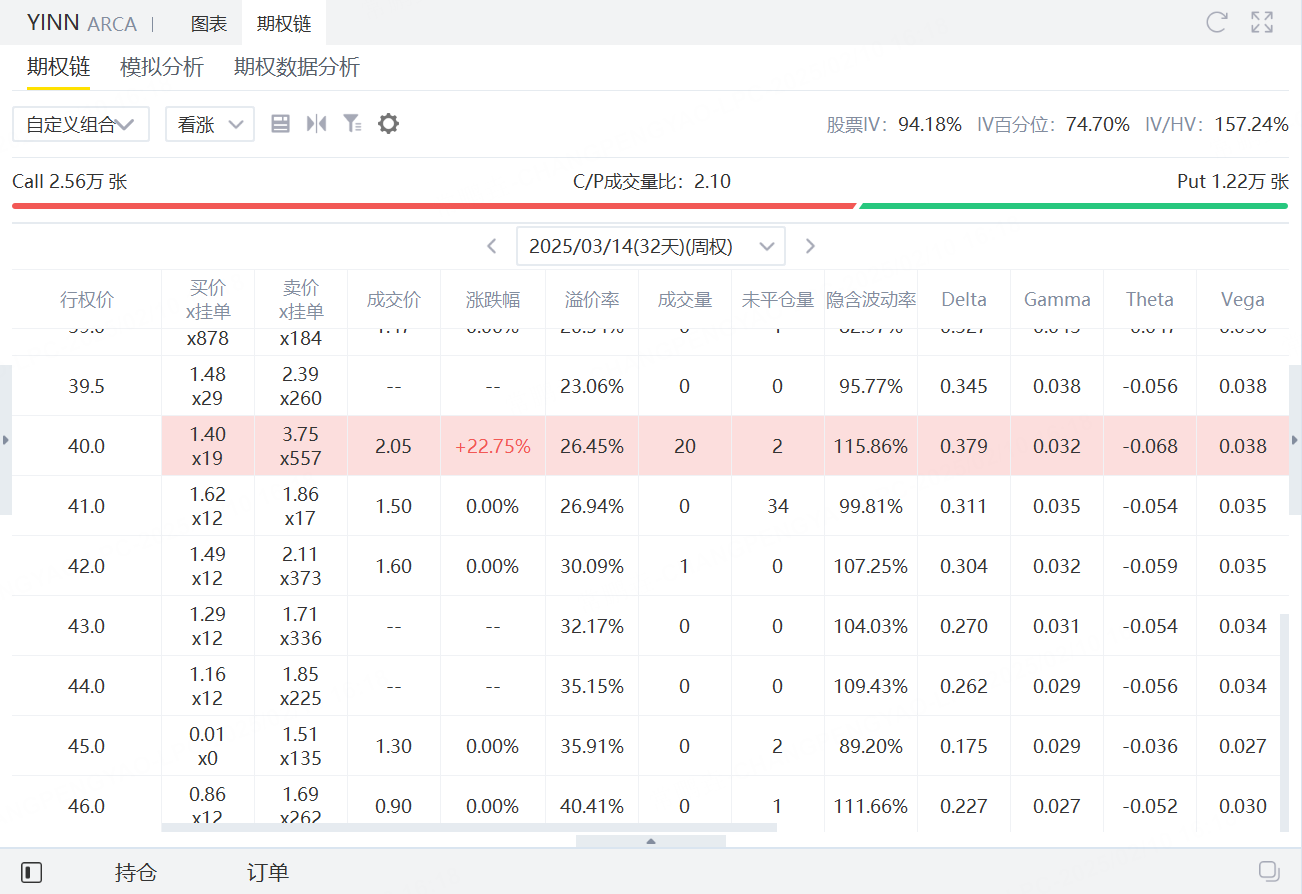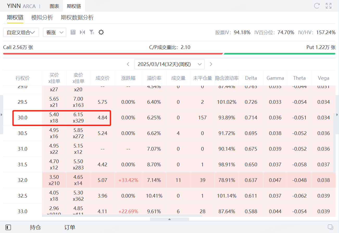 以做空 YINN 为例, $三倍做多富时中国ETF-Direxion(YINN)$ 现价为35.72美元,假设投资者预期3月会下跌到30左右,投资者此时可以使用熊市价差策略来做空YINN。