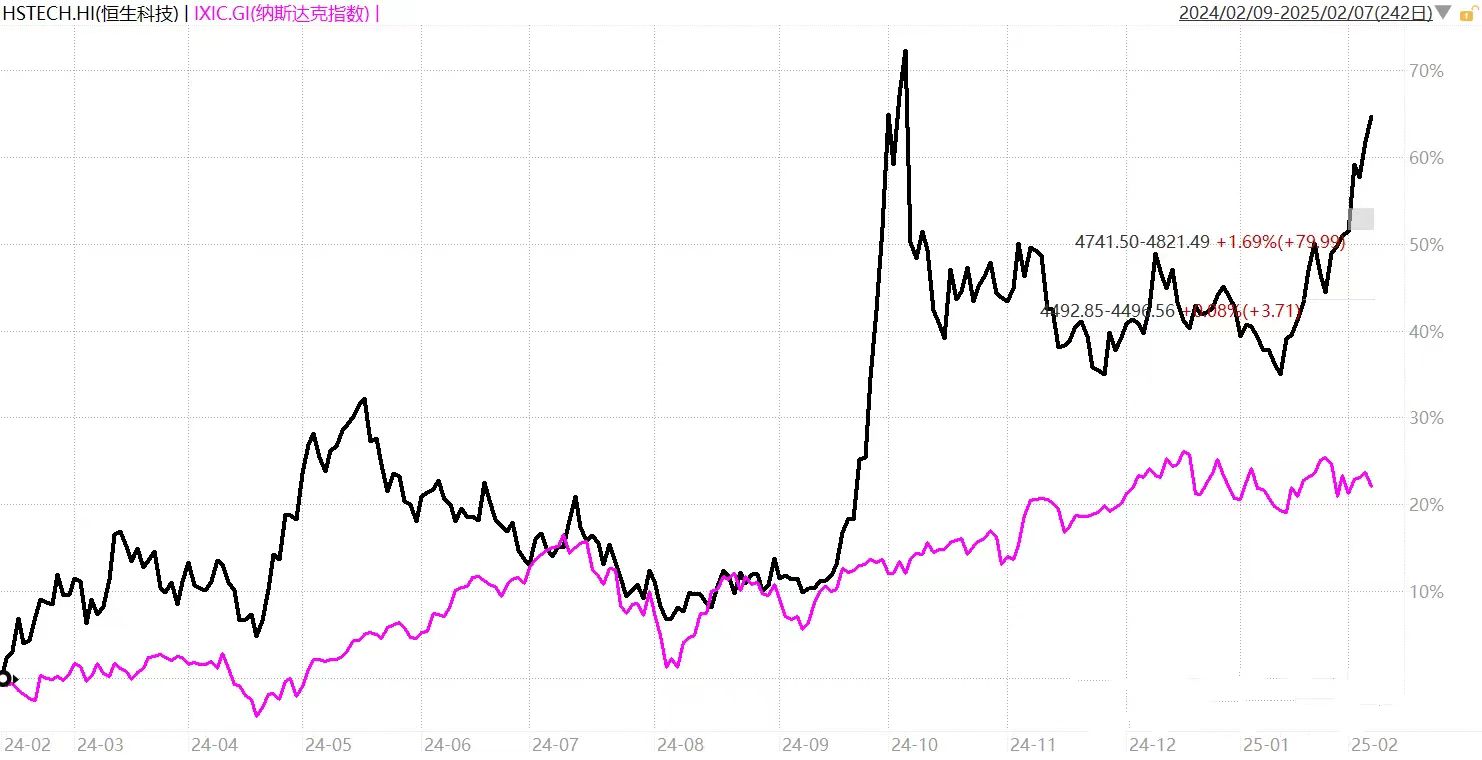 今年以来中国资产再度走强,中概股持续走高,周一 $纳斯达克中国金龙指数(HXC)$ 大涨,创4个月以来的收盘新高;更惊人的是港股,在24年2月9日到25年2月7日的这一年里, $恒生科技指数(HSTECH)$ 是大幅跑赢了 $纳斯达克(.IXIC)$ :