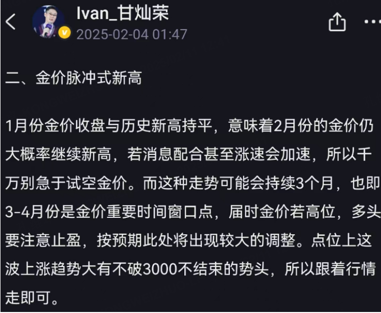 上周的帖子跟大家说过,金价在特朗普的新上任后的关税及美联储不够鹰派的态度下,将可能进入逼仓周期。按黄金价格的周线来看,确实如此,已经连续7周已经是上涨收盘,而且剧烈此前预期的3000点重要大关也就咫尺之间,由于涨速较快,当金价出现调整时,速度也不会太小,而且很可能是阶段性的重要高点,故已持有黄金的朋友则持金待涨,若空仓的朋友可继续耐心等待大幅回调后的介入机会,而急着做空的朋友千万别急于做空以免扛不住。