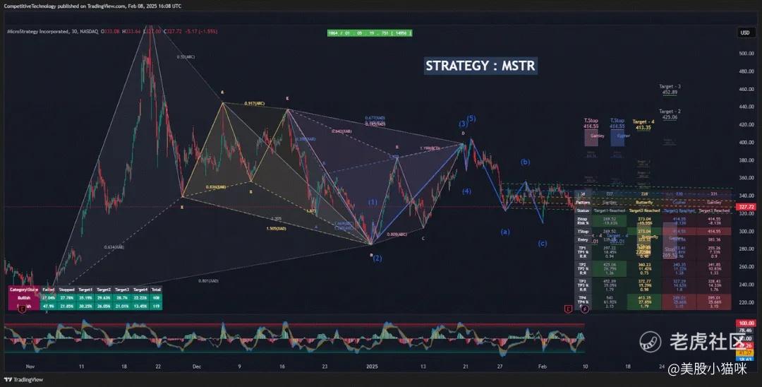 短期来看,MSTR 仍显示看跌谐波形态,这意味着股价仍可能面临一些波动。然而,两个主要的谐波形态已基本完成,表明 MSTR 可能接近下跌周期的尾声。