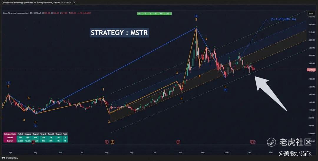 同时,艾略特波浪理论分析表明,如果 MSTR 进入第五浪上涨结构,股价可能上探 587.16 美元(1.618 斐波那契扩展目标)。此外,该目标与 +2 标准差区域接近,表明 MSTR 在此区域内上涨的概率较大,并不会进入超买状态。