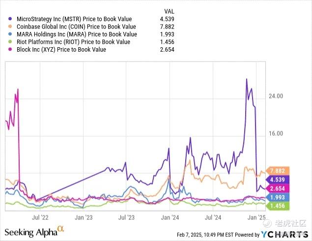 在估值方面,MSTR 的 市净率(P/B) 为 4.359x,尽管较 2024 年底 25x 的水平有大幅回落,但仍然远高于行业平均水平。