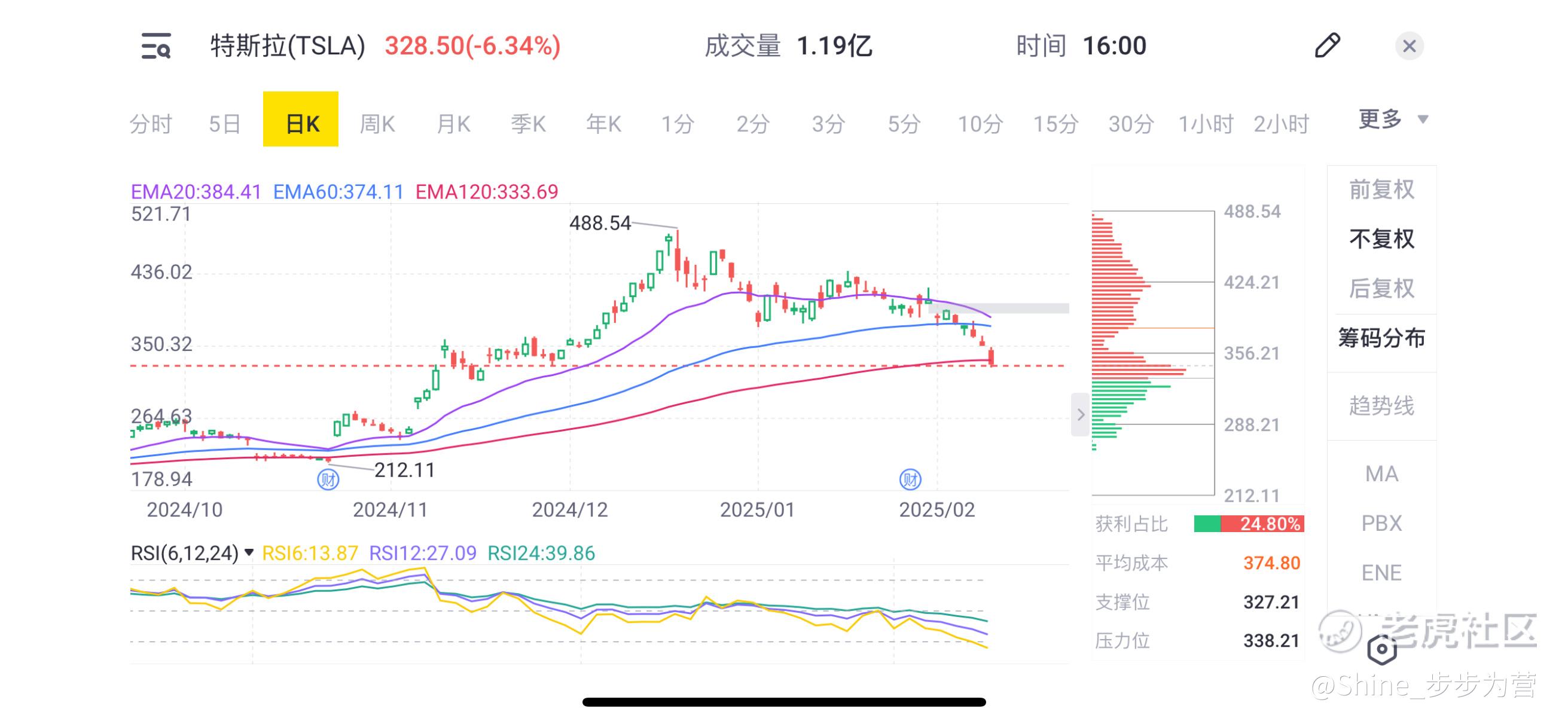 当前已经跌到了关键支撑点:340左右的筹码峰,且RSI已经显示超卖,这里可能会有个反弹(应该会有个逃生机会)。