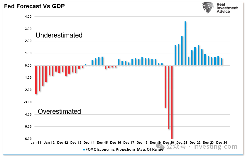 然而,美联储在预测未来经济增长率方面的表现却令人大跌眼镜。下表列出了自2011年以来美联储经济预测范围的平均值与实际GDP的对比情况。