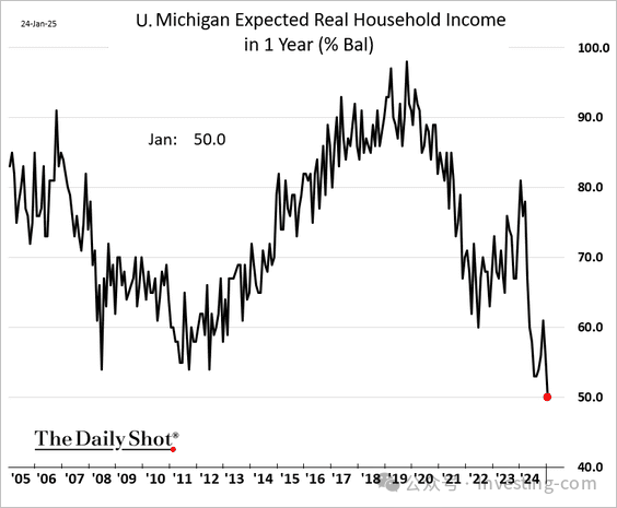 过分依赖历史数据,让美联储政策出错的风险陡增。这种失误,对金融市场、经济增长和消费者信心都可能带来重创。眼下的经济数据看似光鲜,但消费者心里可不这么想。看看他们对未来一年收入的预期,就能窥见一斑。Michael Lebowitz最近也发表了差不多的看法: