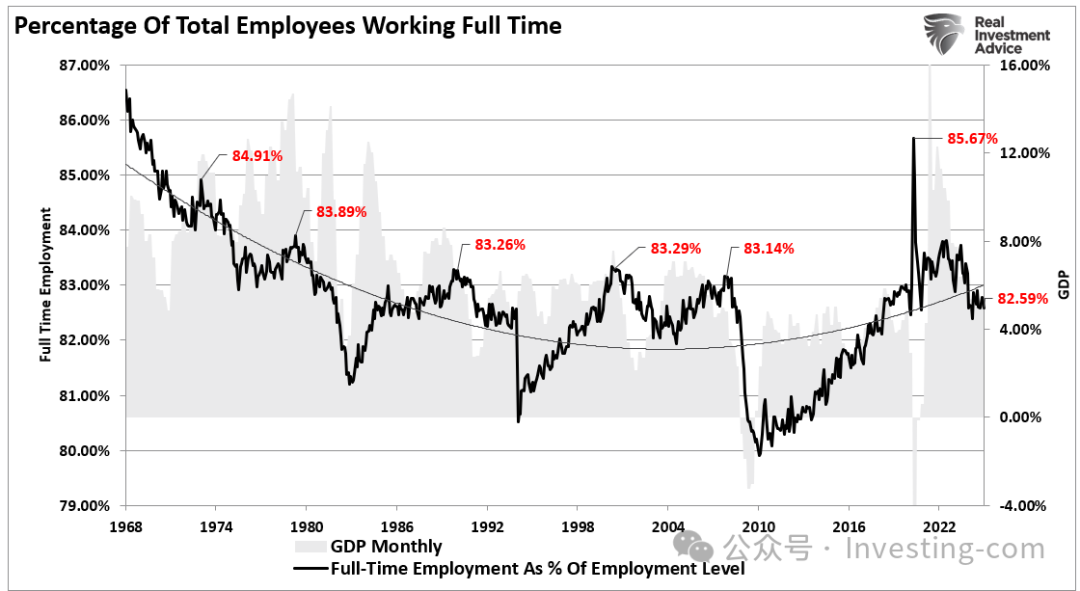 如前所述,就业是创造消费和推动经济活动增长的基础。尤为关键的是,全职就业对于实现更高的经济增长率至关重要,它能带来更高的收入、更好的福利以及家庭稳定性。值得注意的是,当全职就业人数在总就业人数中的比例达到峰值时,往往预示着未来经济表现会疲软,并可能产生通缩影响。(2020年是个特例,当时大规模裁员反而导致全职就业人数暂时增加。)