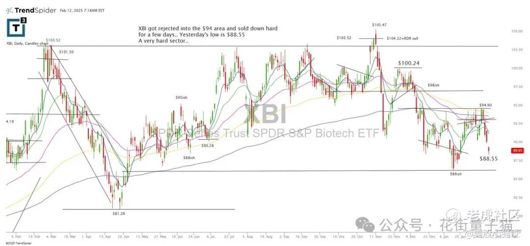 XBI在$94附近受阻并大幅下跌,连续数日疲软。昨日最低点为$88.55,这是一个非常难以操作的板块。