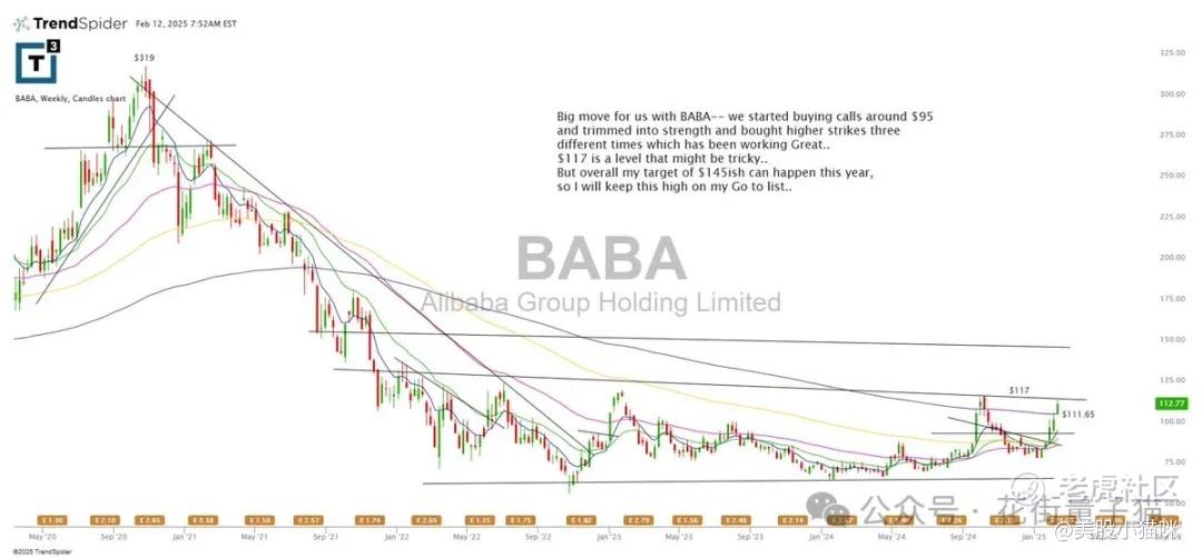 BABA 走势强劲,我们在 $95 附近买入期权,并在上涨过程中多次加仓。$117 可能是个难点,但整体目标是 $145 左右,因此仍然列入重点关注名单。