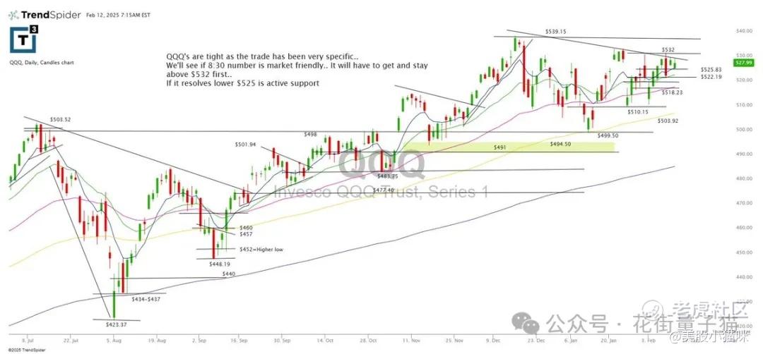 QQQ走势紧凑,交易方向非常明确。我们将观察8:30的数据是否利好市场。它需要突破并保持在$532之上。如果走低,$525为重要支撑位。