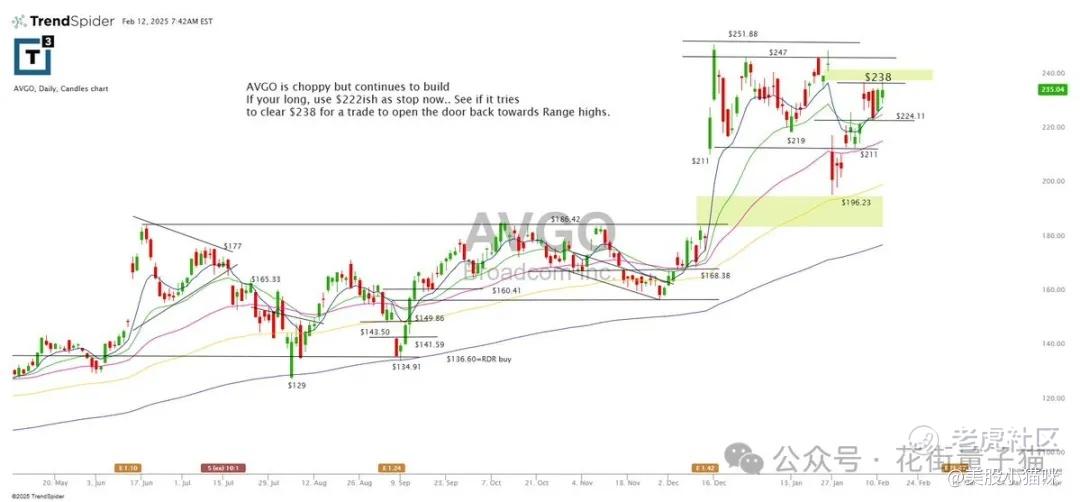 AVGO 走势震荡但持续构建上涨趋势。若持仓,可将 $222 附近作为止损,观察是否能突破 $238 以打开上涨空间。