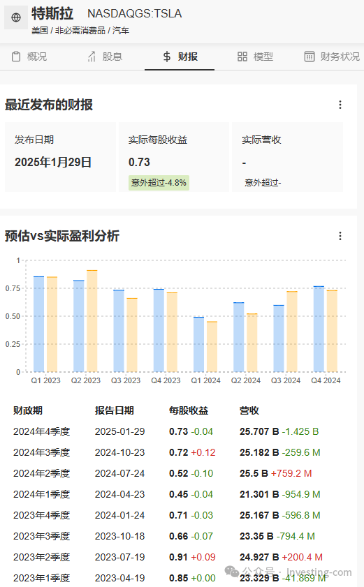 尽管特斯拉股价在大选后一度上升,然而1月29日发布的2024年第四季度业绩泼了一盆冷水,让市场感到失望。财报显示,特斯拉季度每股收益为0.73美元,低于预期的0.76美元;营收为257.1亿美元,未达分析师预期的272.3亿美元。