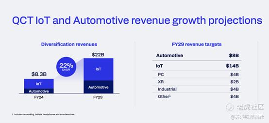 所有这些数据都更有力地表明,高通正在超越对停滞不前的无线手机市场的依赖,以及可能失去苹果作为调制解调器芯片客户的风险。尽管如此,即使到2029财年220亿美元的收入目标,其非手机业务仍落后于去年手机市场近390亿美元的收入。