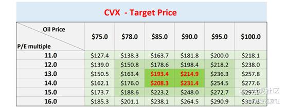 基于上述估计,下表显示了在当前条件下该股票的潜在价值。更明确地说,该表显示了根据对油价的预测以及市盈率倍数对雪佛龙股票的目标价格。最有可能出现的情况用表格中间的红色单元格突出显示,它们都指向巨大的收益。例如,如果油价为85美元,市盈率为13(这是该股票过去的平均市盈率),目标价格约为193美元。