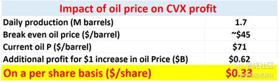基于这些假设,对于每桶油价上涨1美元,雪佛龙的每股收益将增加0.33美元,以当前流通股数量计算。