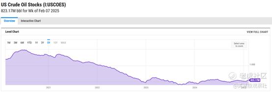 除了SPR之外,美国原油总库存也处于接近历史最低水平。具体来说,下一张由YCharts提供的图表跟踪了过去五年美国的原油库存。如图所示,当前原油库存约为8.23亿桶(数据截至2025年2月7日当周),处于至少五年来的最低水平之一。