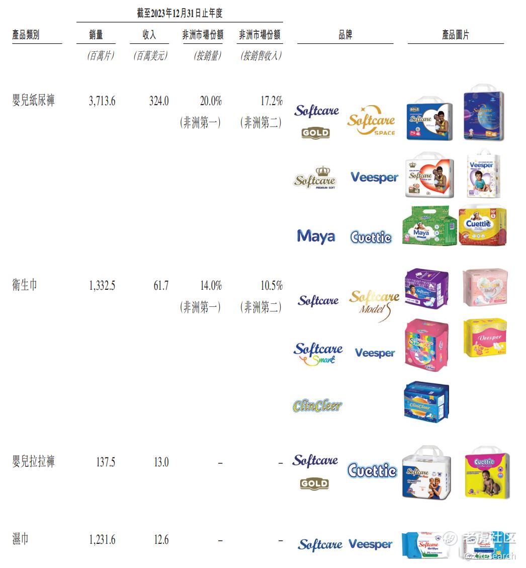 • 市场地位领先:根据弗若斯特沙利文报告,以2023年销量计算,公司在非洲的婴儿纸尿裤市场和卫生巾市场均排名第一,市场份额分别为20.0%和14.0%。