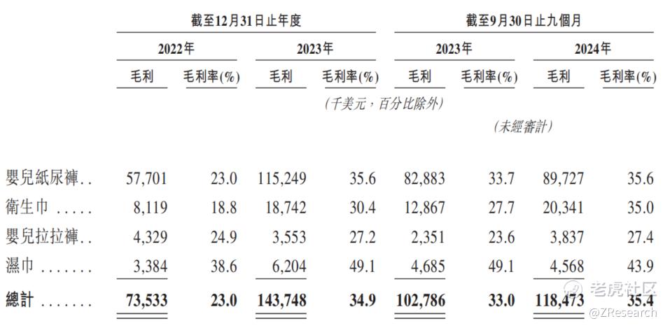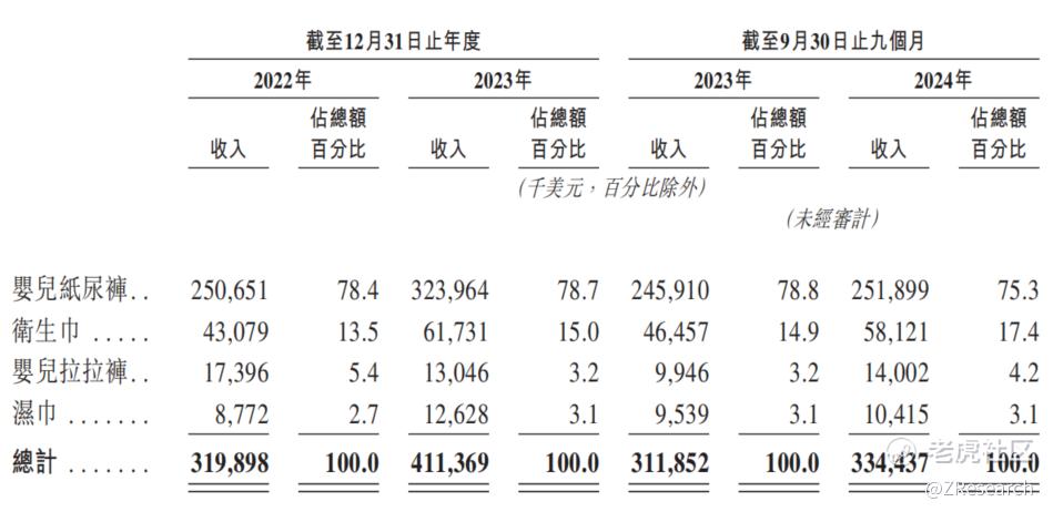 据招股说明书,2022年、2023年及2024年前三季度,乐舒适的营收分别为3.2亿美元、4.1亿美元和3.3亿美元,2023年及2024年前三季度同比增长率分别为28.6%、7.2%。其中,婴儿纸尿裤是主要的营收来源,2024年前三季度占总收入的比重为75.3%。按地域划分,乐舒适的营收主要来自非洲,2024年前三季度的营收占为98.2%