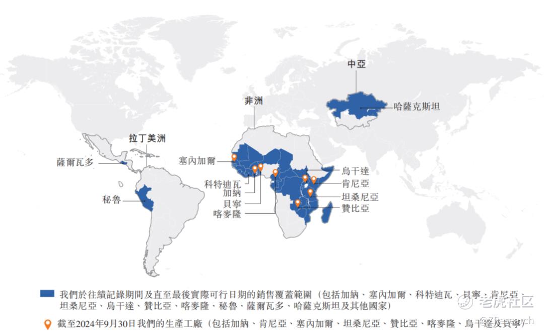 在非洲,线下购买是主要的消费模式,且人口高度分散,成熟的渠道网络需要多年的经营和维护,不易被取代。由于城乡发展不均衡、交运物流网络发展不成熟,消费产品要通过多层级的销售网络才能触达消费者。公司深耕非洲市场超过15年,销售网络覆盖不同国家的大量批发市场、商超及小零售商。截至2024年9月30日,公司在12个国家设立了18个销售分支机构,有超过2,500名客户。根据弗若斯特沙利文报告,公司的销售网络覆盖公司核心经营国家的各个行政区,可触达该等国家80%以上的本地人口。