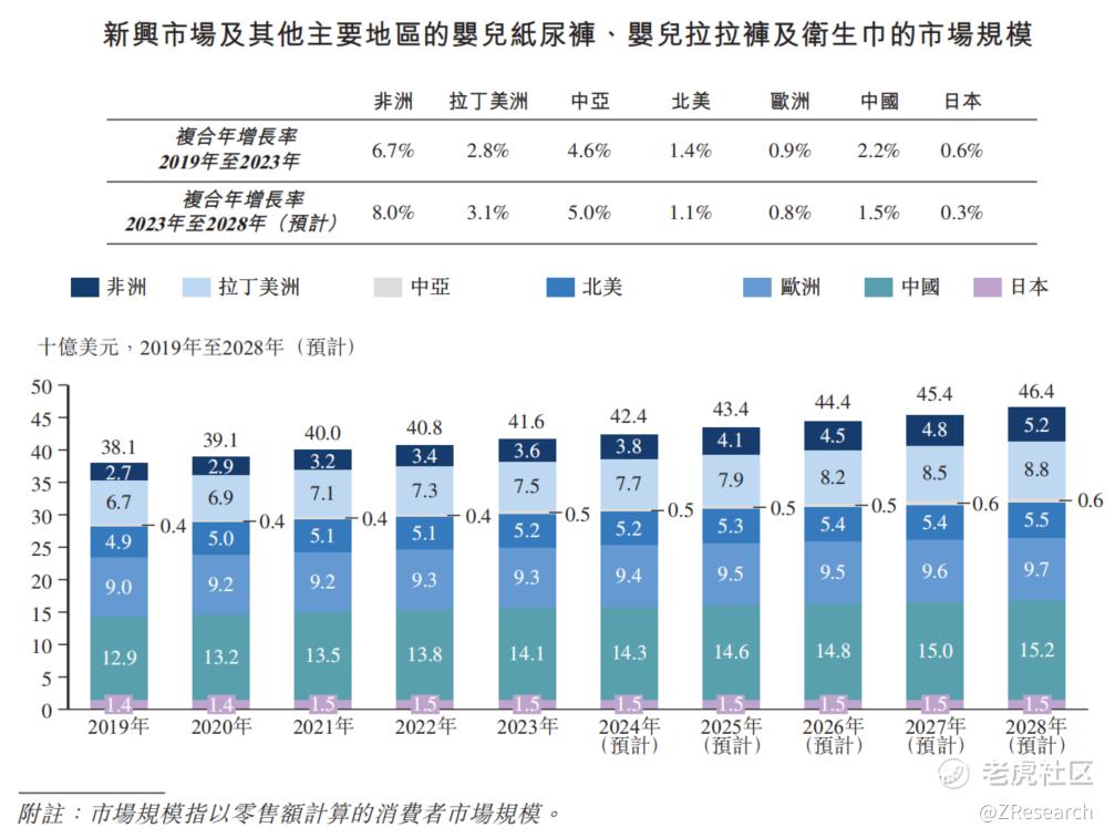 根据弗若斯特沙利文报告,非洲、拉美等新兴市场的婴儿及女性卫生用品市场具有全球最大的增长潜力。2019年至2023年,非洲的新生儿数量复合年增长率为1.5%,位列全球各洲之首,20岁以下人口占比超过50%,人口结构呈现显著增长潜力。根据弗若斯特沙利文报告,于2023年,非洲、拉丁美洲及中亚的出生人口分别为47.0百万、10.1百万及1.9百万,分别占2023年全球出生人口的57.1%、12.3%及2.3%。新兴市场婴儿及女性卫生用品的市场渗透率持续提升,与发达国家相比,有相当大的增长空间。例如,2023年,非洲的婴儿纸尿裤及婴儿拉拉裤市场渗透率为22.7%,低于婴儿纸尿裤及婴儿拉拉裤在欧洲、北美和中国市场介乎约70%至86%的渗透率,而非洲的卫生巾市场渗透率为30.8%,亦低于欧洲、北美和中国市场约为35%至80%的渗透率。