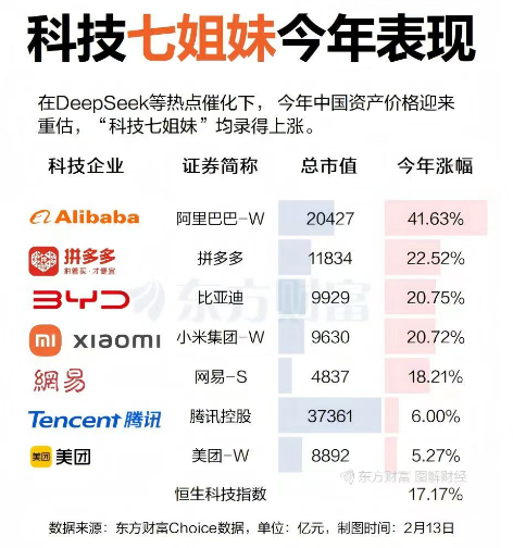 看好的基本上都是中国AI、科技股公司。昨天坐实了阿里&苹果合作正式落地,阿里云开始重估,腾讯又宣布上线接入deepseek的元宝,AI赋能中国科技,我们的“科技七姐妹”也终于上桌了!🔥🔥阿里今年已经40%+了,拼多多、比亚迪、小米也是超20%的涨幅。目前为止阿里最为强势,看到有人对阿里的评价总结:5年回购无人理,一朝AI天下追。(感觉很中肯)[贱笑]