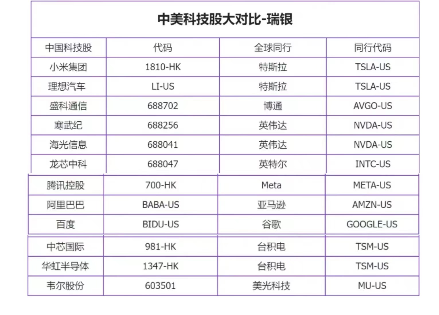海外资金都在看多中国资产,昨天瑞银做了一个中美科技股对标报告,旗帜鲜明地看多中国资产价值重估——很简单粗暴,阿里对亚马逊,腾讯对Meta,比亚迪+理想+小鹏+小米等于特斯拉,金山办公等于微软,中芯国际等于台积电,寒武纪+海光信息等于英伟达。捡了一些来看:[吃瓜]