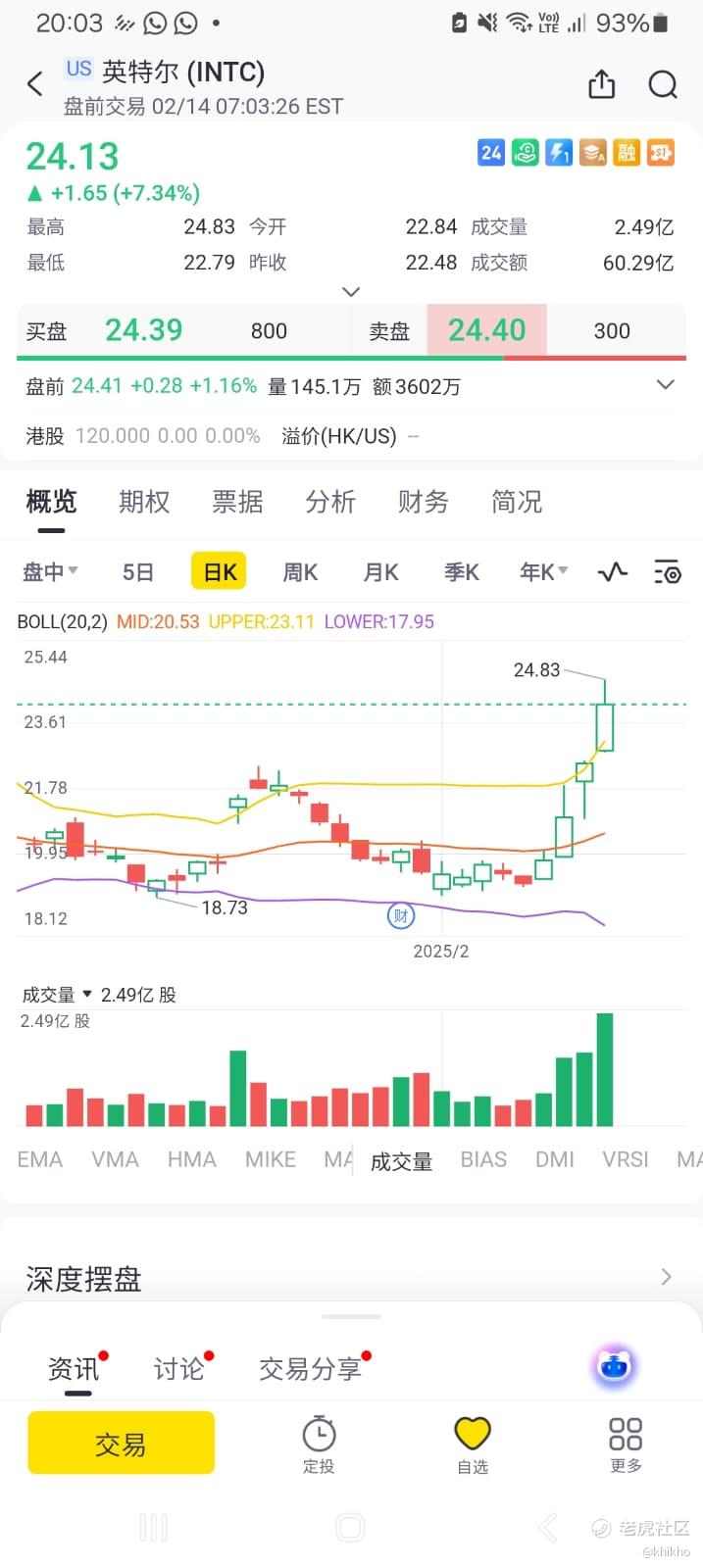 - 市场情绪和投资者信心:市场对英特尔与台积电合作的传闻以及英特尔产品性能提升等消息反应积极,投资者信心增强,大量资金流入英特尔股票,推动股价上涨。这种市场情绪的带动下,更多投资者跟风买入,进一步推高了股价。