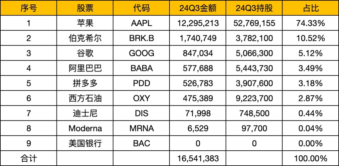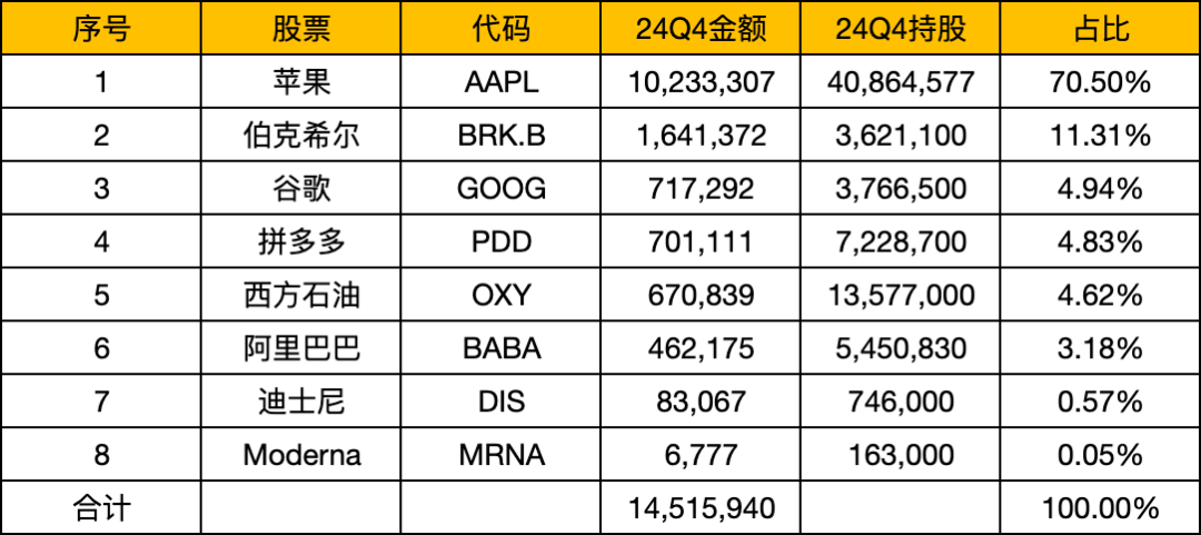 24Q4段永平持有8只股票,持仓数量和持仓标的跟Q3保持一致,没有任何变化。