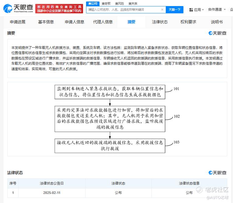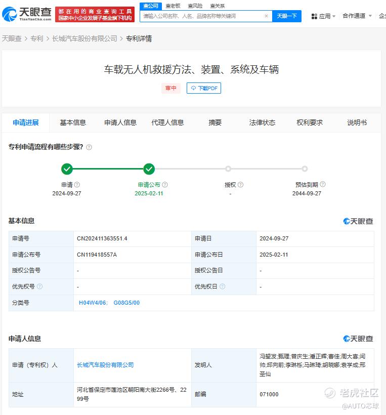 天眼查知识产权信息显示,近日,长城汽车股份有限公司申请的“车载无人机救援方法、装置、系统及车辆”专利公布。