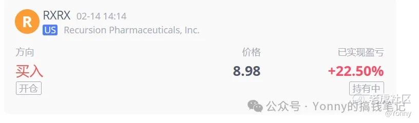 2)RXRX:周五的盘前也追了点这个AI医疗票,用于替代马上要被call走减仓的TEM。这个比TEM位置低点,而且是英伟达持仓的概念(英伟达刚刚披露的报告,一股没减)。 两个热门概念叠加起来,感觉有一定空间。目前已经浮盈巨大了。会按1h或者4h向上做移动止盈。