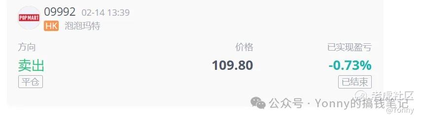 3)泡泡玛特:这也是在2月14日当天,日内开仓又平仓的一个单子,不过是被止损了。大涨之下居然没赚钱,反思一下。
