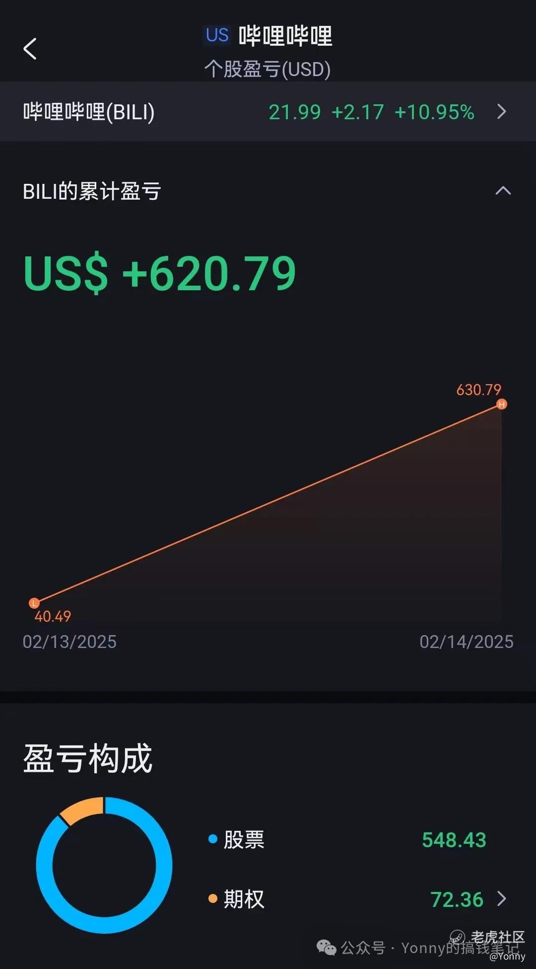 B站也赚得不错。虽然只有几百刀,但毕竟就两天时间,也还可以了(FUTU也是一样的操作,只不过用的是短CALL)。下周再挖掘新的中概机会。