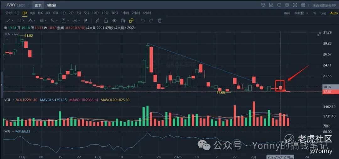 2)没想到机会很快就来了。2月12日市场低开,VIX上升,趁机开空UVXY继续赚钱。当日这一单妥妥的空在最高点,舒服了。