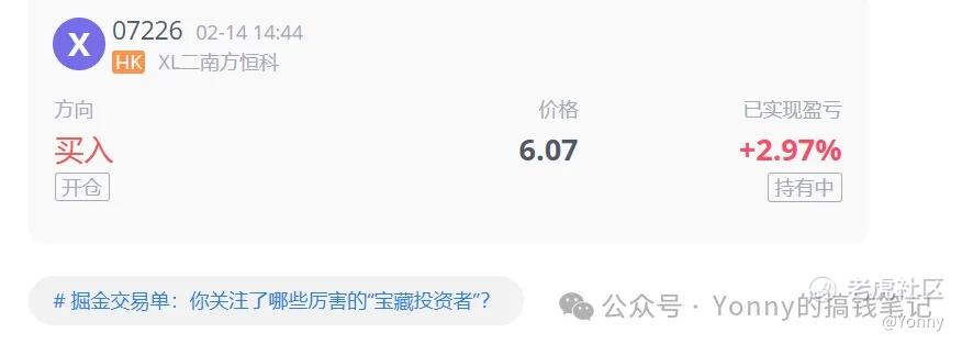 比如在2月13日就极限操作了一波恒科。早盘分批买入,午盘冲高,一度浮盈巨大,可惜下午直接砸下来给我打移动止盈了。但是2月14日,在恒科收复上一日的上影线最高点后,我又把仓位陆续加到了3-4%,目前浮盈中。