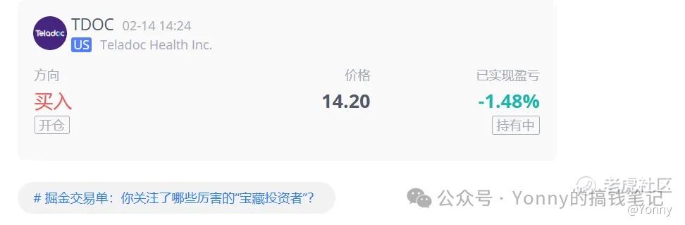 3) TDOC: 这是另一小仓位单追加的AI医疗概念股,微亏中。同样会做移动止盈止损。整体AI医疗概念股控制在5%以下仓位,轻仓博弈高赔率。