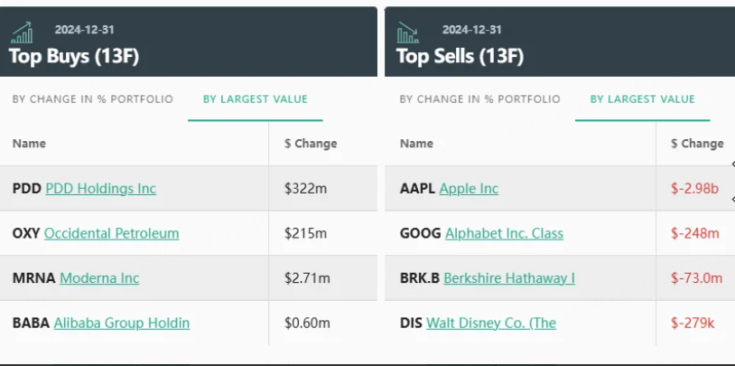 相比Q3,Q4大幅加仓拼多多,小幅加仓了阿里巴巴,减持了苹果、伯克希尔,截止四季度末,苹果持仓还是占大头,占比70.5%。(可能是出于对美股高位止盈,以及看好中国互联网行业前景的想法~)