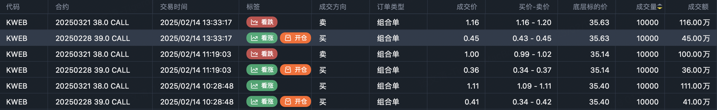 2roll仓近期上周五大单异动出现了,38call $KWEB 20250321 38.0 CALL$ roll39call $KWEB 20250221 39.0 CALL$ ,到期日从3月21日roll到2月28日。