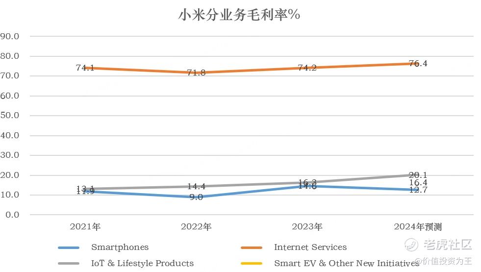 从毛利率上看,小米手机只有12.7%;IoT20%;小米汽车16.4%;互联网服务76%: