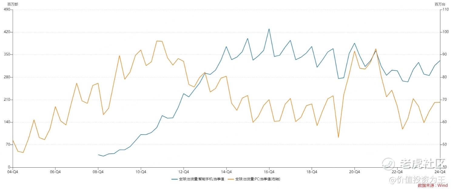 从成长性上看,小米手机已经停滞了3年,从全球智能手机出货量来看,手机行业已经触及天花板,未来很难有所突破,PC亦如此: